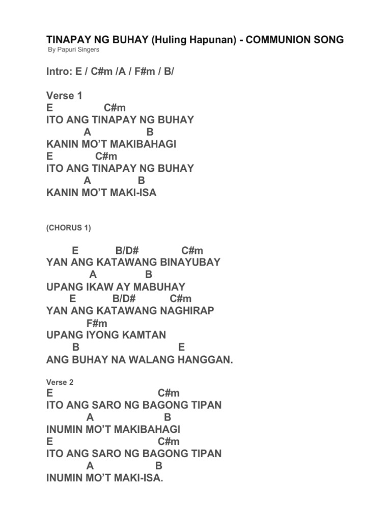 Huling hapunan tinapay ng buhay - lyrics i ito ang tinapay ng buhay kunin mo at ibahagi ito ang tinapay ng buhay kanin mot maki-isa chorus yan ang katawang ibinayubay upang ikaw ay mabuhay yan ang katawang naghirap upang iyong kamtan ang buhay na walang hanggan. Directed by Amalia Tandang. I-share I-share Mga Aral na.